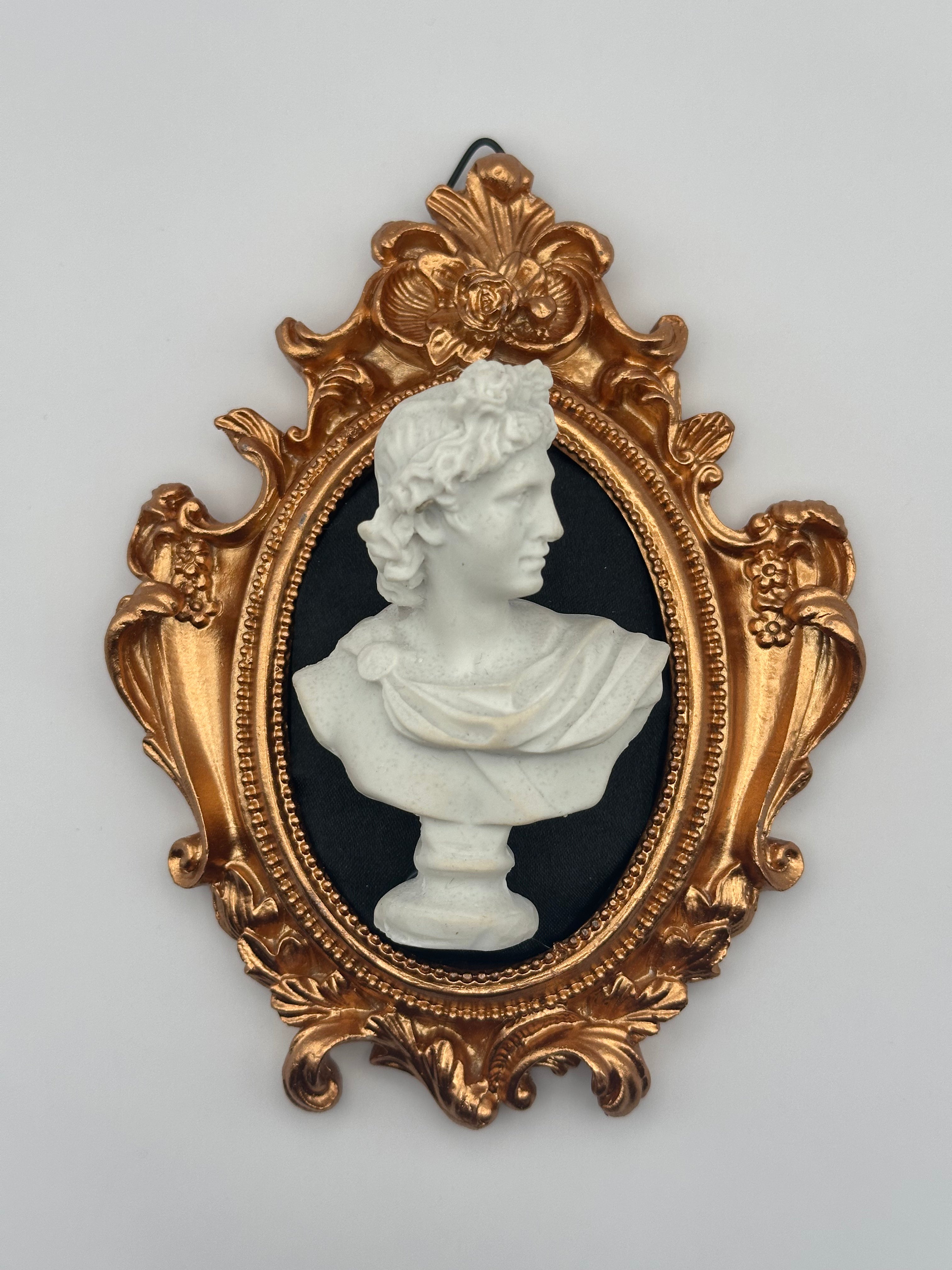 Assemblaggio Artigianale: Il busto viene colato e rifinito a mano, e l'intero pezzo viene assemblato con cura nel suo sfondo scuro e nella cornice, rendendo ogni articolo un pezzo unico.
