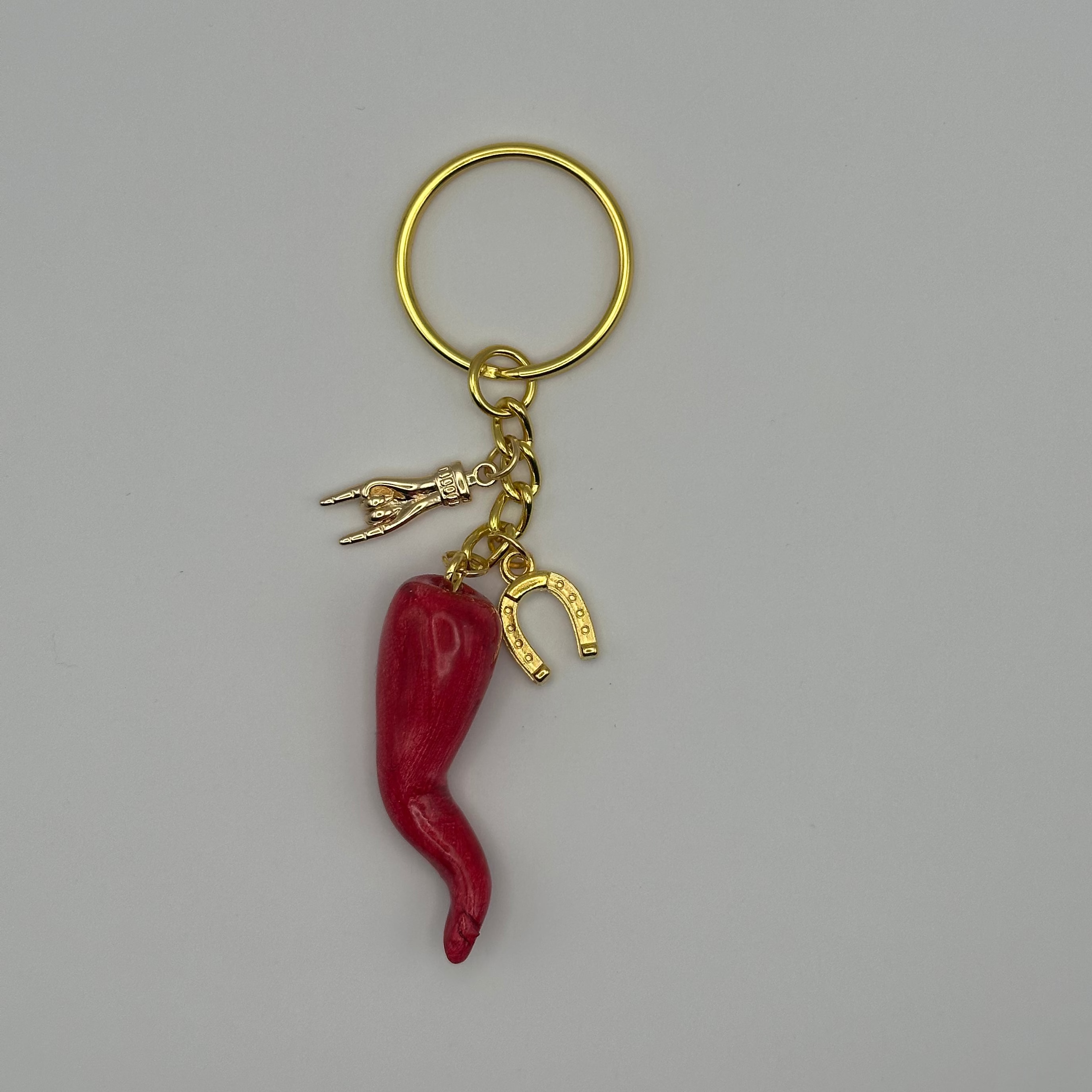 Cornetto Portafortuna Artigianale (ORO) – Portachiavi Amuleto con Corna e Ferro di Cavallo Fatto a Mano